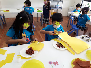 絵を描いた後は、ハート型の画用紙やきらきらの飾りを糊ではりました。